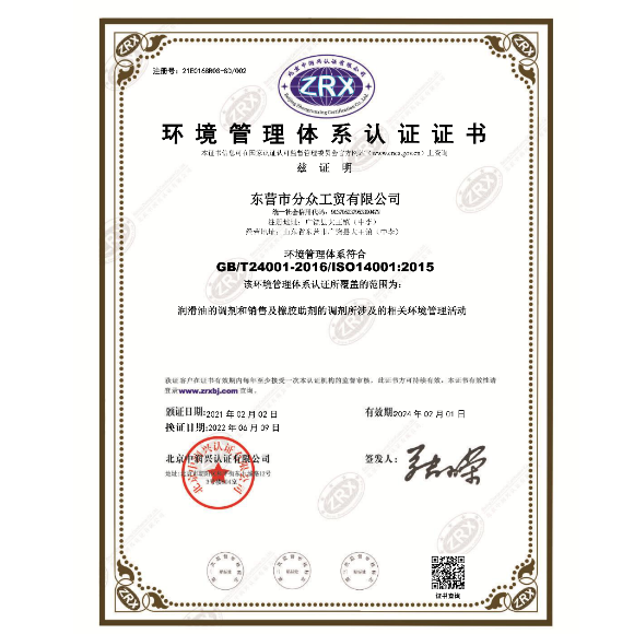 通过ISO9001- 2000质量管理体系及ISO9001- 14001环境管理体系认证。年产1万吨环保润滑油项目通过环保部验收。2023年危险废物产生信息如下:废活性炭0.02t、废机油0t、废uv灯管0t。2024年5月处理并转移了废活性炭0.02t。