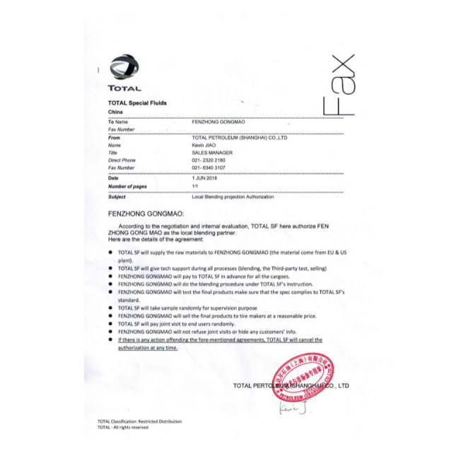 与法国道达尔中国有限公司(Total)合作开发了环保重质环烷油FZ-500、FZ-600、FZ-700及环保橡胶油(TDAE)系列产品,正式成为该公司合作企业。